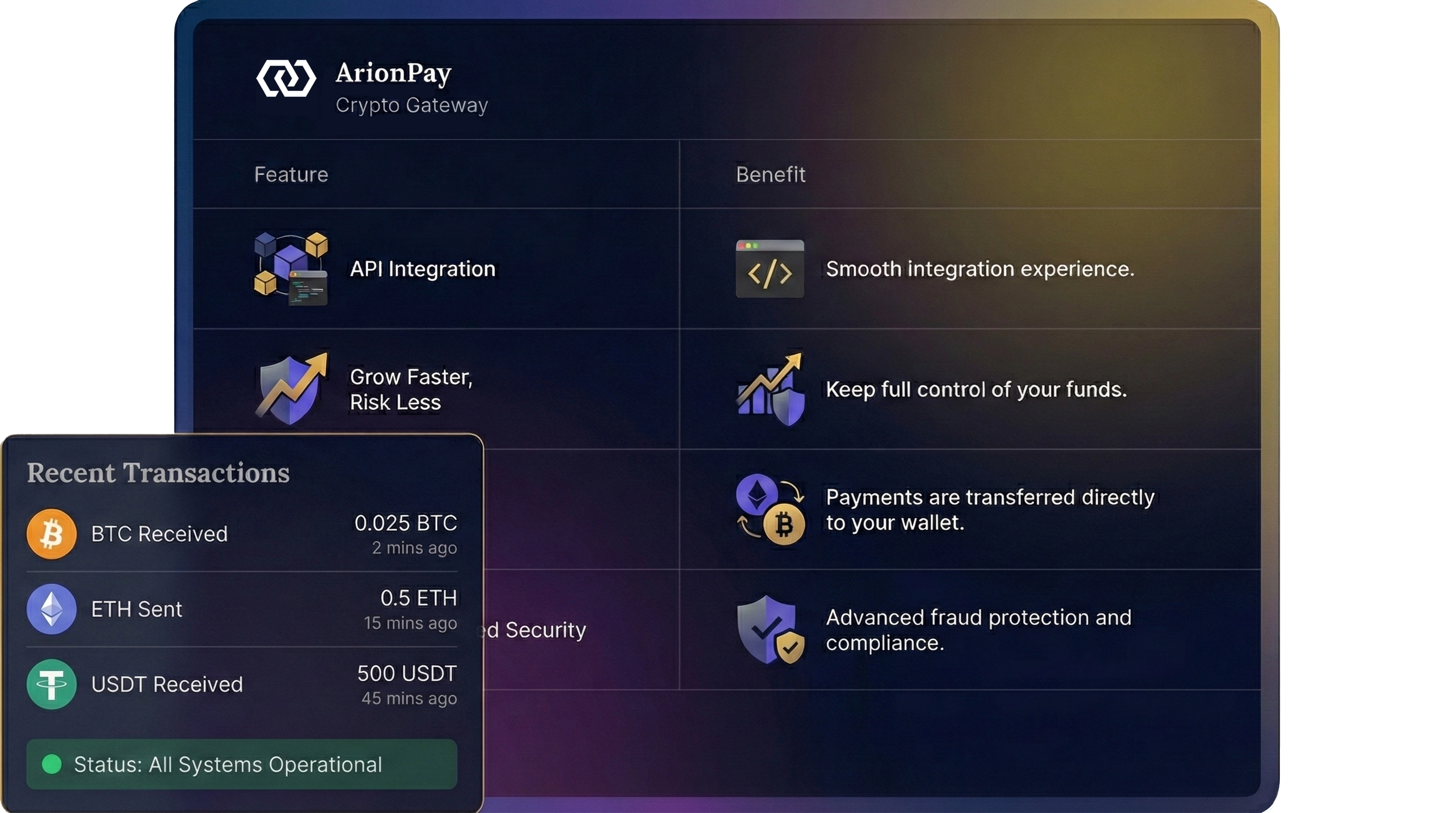 ArionPay crypto gateway is designed for a smooth integration experience. Our crypto API enables you to accept cryptocurrencies on your website while keeping full control of your funds, payments are transferred directly to your wallet.