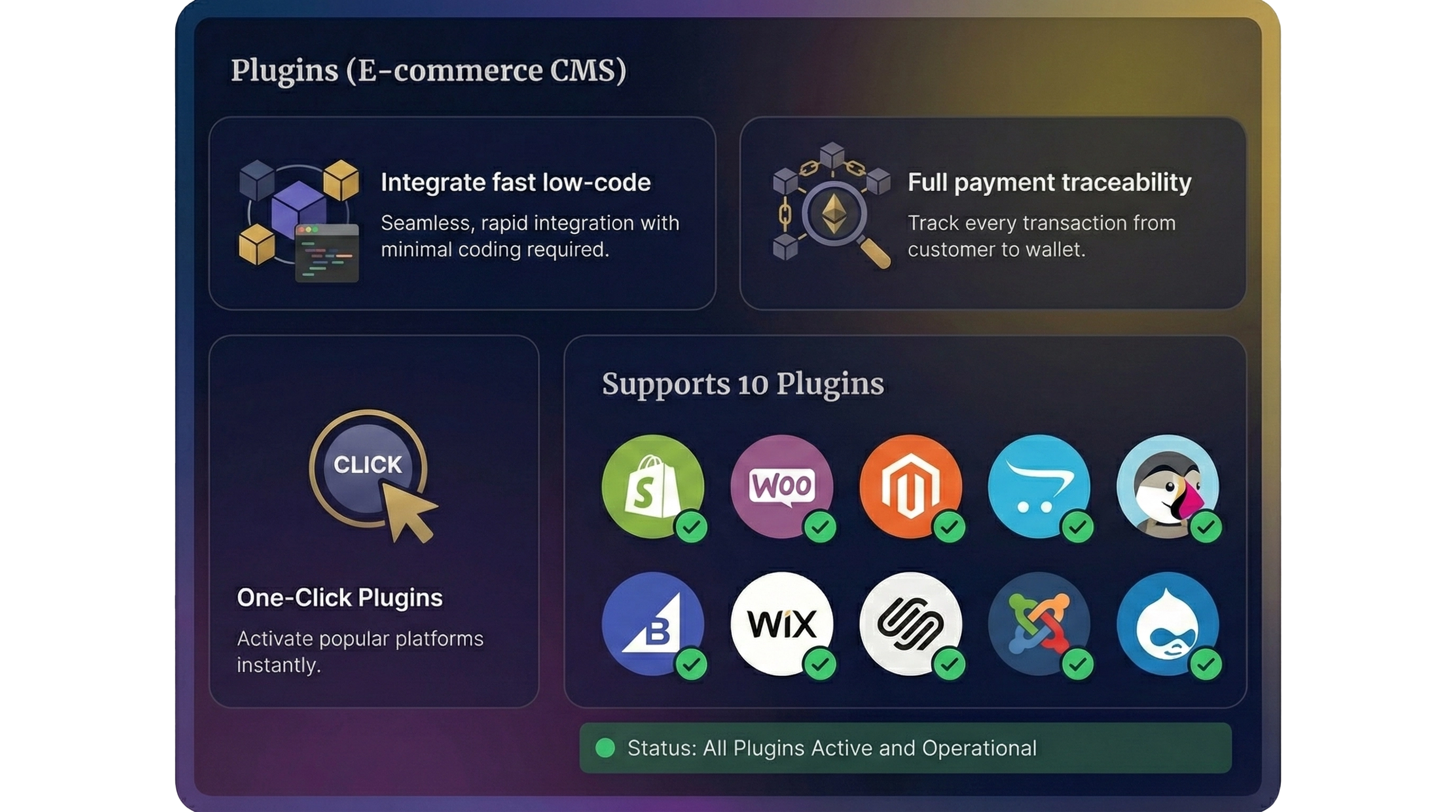 With E-commerce Plugin Integration, you’re just one click away from accepting crypto payments.